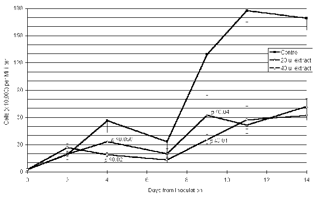 Figure 1. The Effect of Broccoli Extract on the Growth of MCF-7 Human Breast Cancer Cells. Broccoli extract inhibited the growth of MCF-7 transformed human breast cells at both concentrations; the decrease in cell growth was statistically significant (Student's t-test).