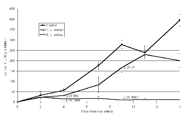 Figure 3. The Effect of Broccoli Extract on the Growth of v-ras-RAT1 Rat Fibroblasts. Broccoli extract inhibited the growth of v-ras-transformed RAT1 rat fibroblast cells in a concentration-dependent manner. These results were statistically significant (Student's t-test).