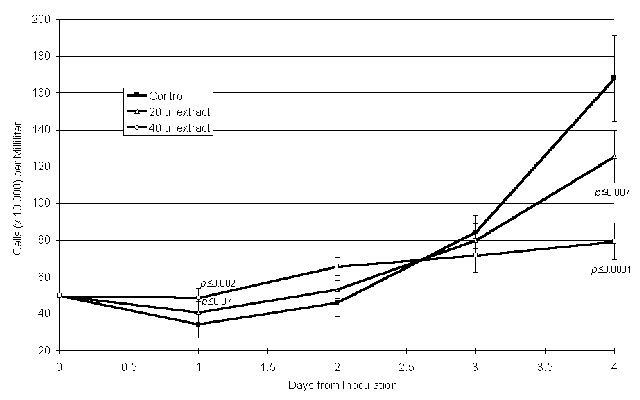 Figure 5. The Effect of Broccoli Extract on the Growth of Non-transformed Human Lymphocytes. Both concentrations of broccoli extract initially induced the growth of PHA-stimulated human lymphocytes cells (days one and two), but then inhibited growth. This biphasic effect was different than the inhibition of growth observed transformed cells.