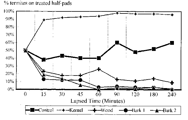 Figure 5. Number of termites on extract-treated pad halves in repellency tests.